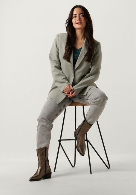 Stap stijlvol de dag in met deze goudkleurige enkellaarzen van NOTRE-V. Met de 18050 aan je voeten straal je zelfvertrouwen uit. Combineer deze trendy schoenen met een zwarte skinny jeans en een oversized trui voor een casual look. Of draag ze onder een feestelijke jurk voor een elegante touch. Het bovenwerk bestaat uit leer en heeft city western accenten, zoals het stikselpatroon op de voorvoet, de puntige neus, de houtlook blokhak en de aantreklus aan de buitenzijde. Dit model trek je gemakkelijk aan door de ritssluiting aan de binnenzijde. Met deze enkellaarzen ben je altijd on-trend. Laat je creativiteit de vrije loop en creëer jouw eigen unieke stijl. Dames, laat jezelf zien met deze enkellaarzen van NOTRE-V!