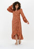 Mooie jurk in een mooie warme kleur. Ik vind hem iets ruim vallen. Vooral de overslag is ruim.